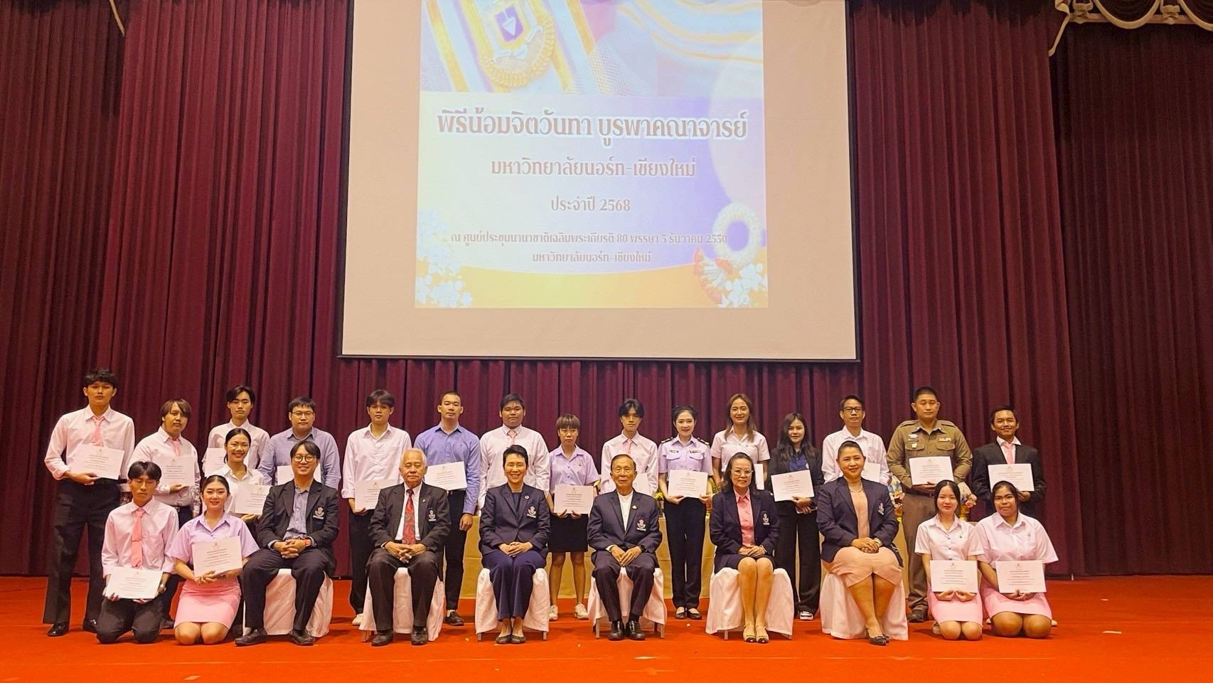 หลักสูตรศึกษาศาสตรมหาบัณฑิต สาขาวิชาหลักสูตรและการสอน คณะสังคมศาสตร์และศิลปศาสตร์ มหาวิทยาลัยนอร์ท-เชียงใหม่ จัดพิธีไหว้ครู สาขาวิชาหลักสูตรและการสอน ประจำปี 2568 โดยได้รับเกียรติ จากอาจารย์ประจำ และอาจารย์พิเศษ เข้าร่วมในวันเสาร์ 4 มกราคม 2568 ณ ห้องประชุมรัฐมนตรี มหาวิทยาลัยนอร์ท-เชียงใหม่