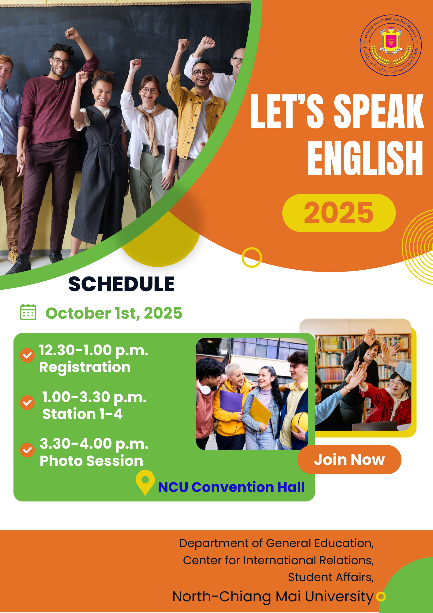 ประชาสัมพันธ์กิจกรรมในรายวิชาภาษาอังกฤษ "LET'S SPEAKING ENGLISH" จัดกิจกรรมในวันพุธที่ 2 ตุลาคม 2567 ณ หอประชุมนานาชาติ อาคารเฉลิมพระเกียรติ 80 พรรษา 5 ธันวาคม 2550 มหาวิทยาลัยนอร์ท-เชียงใหม่ ร่วมกับศูนย์ส่งเสริมความสัมพันธ์ระหว่างประเทศ และสำนักกิจการนักศึกษา มหาวิทยาลัยนอร์ท-เชียงใหม่