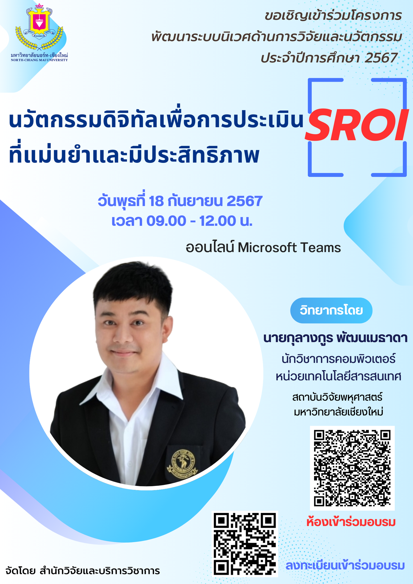 สำนักวิจัยและบริการวิชาการ ขอเชิญเข้าร่วมโครงการพัฒนาระบบนิเวศด้านการวิจัยและนวัตกรรม ประจำปีการศึกษา 2565 หัวข้อ “นวัตกรรมดิจิทัลเพื่อการประเมิน SROI ที่แม่นยำและมีประสิทธิภาพ” วิทยากรโดย นายกุลางกูร พัฒนเมธาดา นักวิชาการคอมพิวเตอร์ หน่วยเทคโนโลยีสารสนเทศ สถาบันวิจัยพหุศาสตร์ มหาวิทยาลัยเชียงใหม่ ในวันพุธที่ 18 กันยายน 2567 ระหว่างเวลา 09.00 – 12.00 น. ระบบออนไลน์ Microsoft Teams ลงทะเบียนเข้าร่วม https://forms.office.com/r/FfXCQ1W6V0